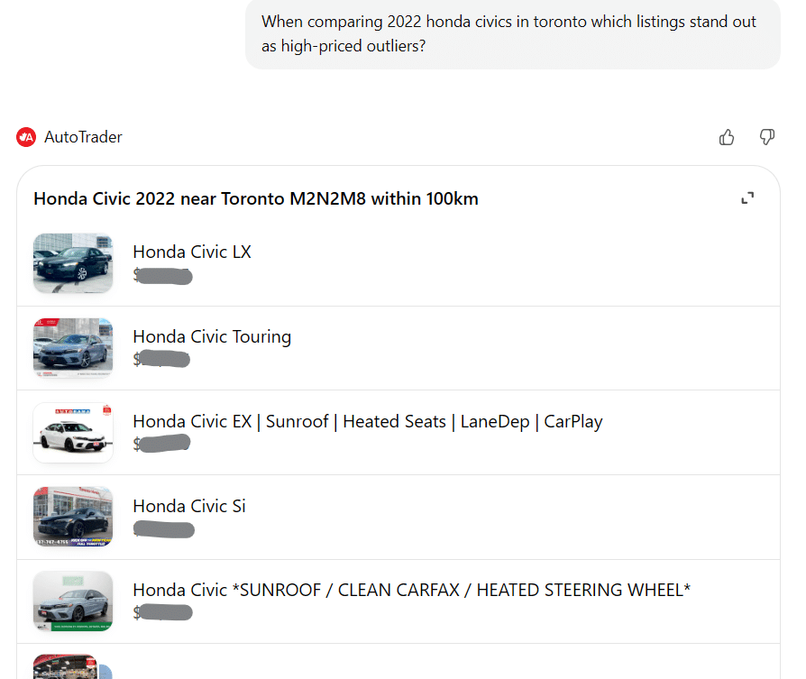 For years, online car shopping has been driven by static filters, manual comparisons, and often opaque listings. A native GPT changes that model entirely. Search becomes conversation. Filtering becomes interpretation. And the user experience moves from browsing to assisted decisioning.